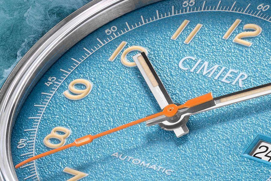 - Brushed baton hour and minute hands with polished chamfers. Orange-painted seconds hand. All hands filled with Swiss Super-Luminova GL old radium (LE) lume.